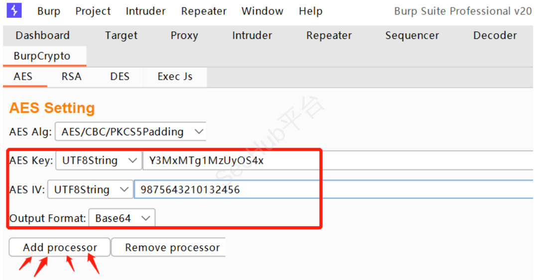 如果前端存在,key泄露,可以使用burpcrypto插件,选择好模式、key、IV以后点击Add processor,然后会弹出来一个对话框,输入一个名称即可,